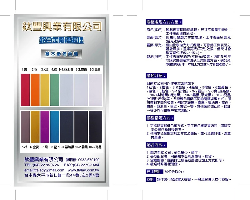 鈦豐興業有限公司成立於1985年,為各式鋁合金陽極處理及硬膜陽極處理及染色的專業廠,超過26年來不斷提升累積各種鋁合金陽極處理等相關技術與經驗,以交期迅速、技術創新、品質信賴、服務貼心為企業精神,在鋁合金相關零件與製品的產業領域中,不斷研發新技術與成本改善,提供客戶卓越專業的陽極處理品質與服務。